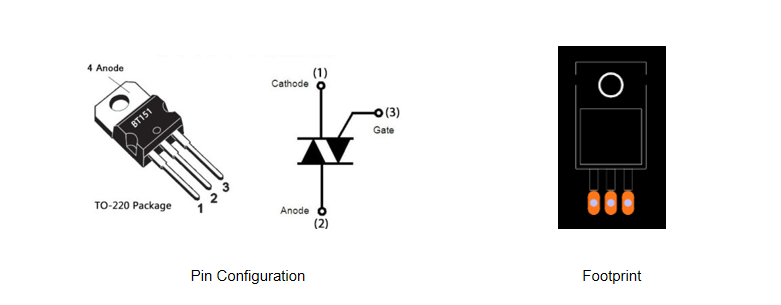 BT151의 발자국 및 핀 구성은 다음과 같습니다.